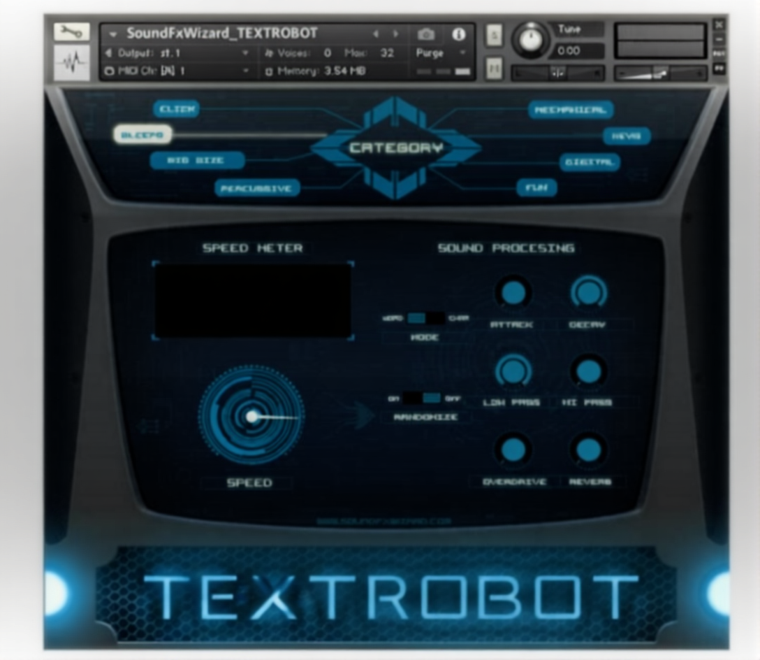 Getting started with SoundFxWizard – Textrobot is a breeze thanks to its clean and intuitive user interface. Once loaded into Kontakt (version 5.5 or higher), you’ll find a well-organized layout that puts all the essential controls right at your fingertips.